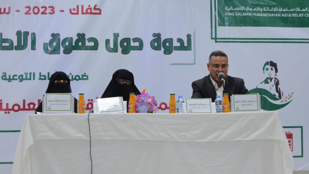 وفي إفتتاحية الندوة ألقى الدكتور مرشد الجرو عميد الكلية والمشرف على الندوة كلمةً أشار فيها إلى انعقاد الندوة يأتي انطلاقاً من رسالة ورؤية الكلية ودورها الريادي في خدمة الأسرة والمجتمع، كما استعراض في كلمته محاور الندوة والأوراق العلمية المشاركة. بعد ذلك تحدث الأستاذ الدكتور عمر عقيلان نائب رئيس الجامعة لشئون الطلاب عبّر في حديثه عن شكره لمركز الملك سلمان للإغاثة والأعمال الإنسانية لإقامته مثل هذه المشاريع المهمة لتحسين العملية التعليمية والتربوية في اليمن وأشار إلى مدى أهمية تعليم الأطفال خصوصاً مرحلة التعليم الأساسي والتي تعتبر مرحلة تعليمية إلزامية لكل طفل وكيف أنّ للنزاع المسلح أثره السلبي في تسرب الطلاب وإتجاههم للتجنيد أو العمالة في المطاعم والورش على حساب تعليمهم. كما أعطى ضابط مشروع إدماج الأطفال المرتبطين سابقاً بالنزاع المسلح الأستاذ محرم المحمودي شرحاً وافياً عن المشروع الذي استهدف الأطفال الذكور الذين تتراوح أعمارهم من ١٢ إلى ١٦ سنة واحاطتهم بالرعاية والتأهيل العقلي والنفسي والتعليمي لثلاثة أشهر متتالية للتغلب على جميع المشكلات التي تواجههم قبل أن يعودوا إلى مجتمعهم.